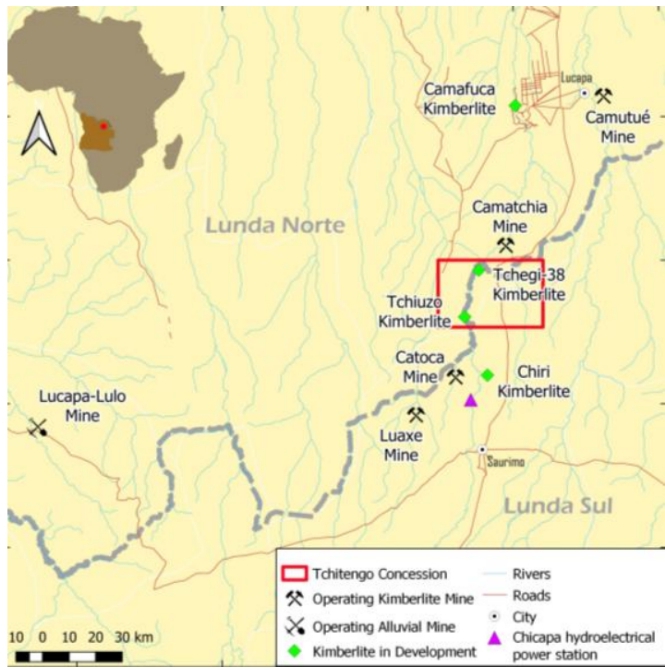 historicamente US$ 58,3 milhões na prospecção e desenvolvimento da concessão Tchitengo, incluindo US$ 33,3 milhões no kimberlito Tchiuzo.